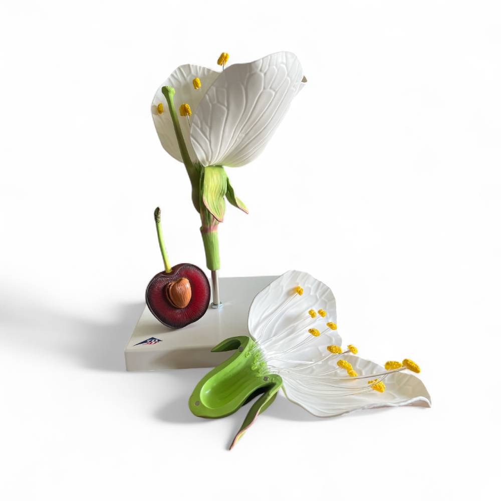 The cherry blossom is magnified 7 times and can be separated into two halves to reveal its internal reproductive anatomy, including a removable ovary with style and stigma. The accompanying cherry fruit is shown at 3 times its natural size, allowing students to study the transition from flower to fruit with clarity and precision.