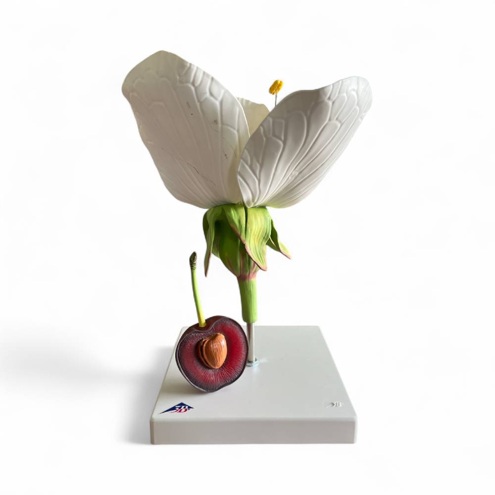 The 3B Scientific® Cherry Blossom with Fruit (Prunus avium) Model is an enlarged, three-dimensional teaching tool designed to demonstrate the floral structure and fruit development of the wild cherry tree.