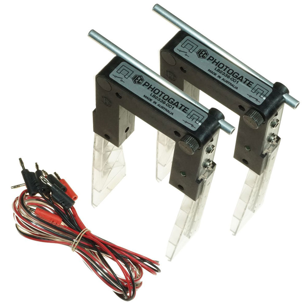 The IEC PHOTOGATE KIT contains 2x universal Photo Gates with all the cables and plugs required for connecting them to a digital Timer. The optional IEC Timer 45ATPGT is one of several types of IEC Timers that perform well. The Gates are supplied with special legs that can be pushed firmly into the sides of the Gates to permit them to engage firmly to the outer corners of the normal triangular Air Track so the Gates become integral with the Track and can be slid along the track to any position.