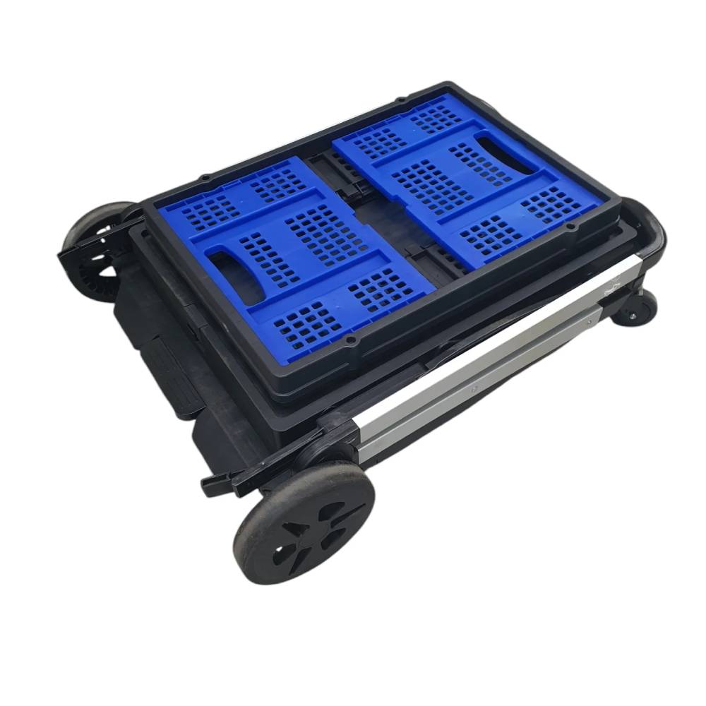 Constructed from hard-wearing injection-moulded plastic and aluminium, the trolley is lightweight yet strong, with a total load capacity of 90kg. A pram-style handle ensures smooth steering, while removable plug-in wheels and a foot pedal brake system provide easy manoeuvrability and stability. At only 10kg total weight, it’s simple to fold, move, and store.