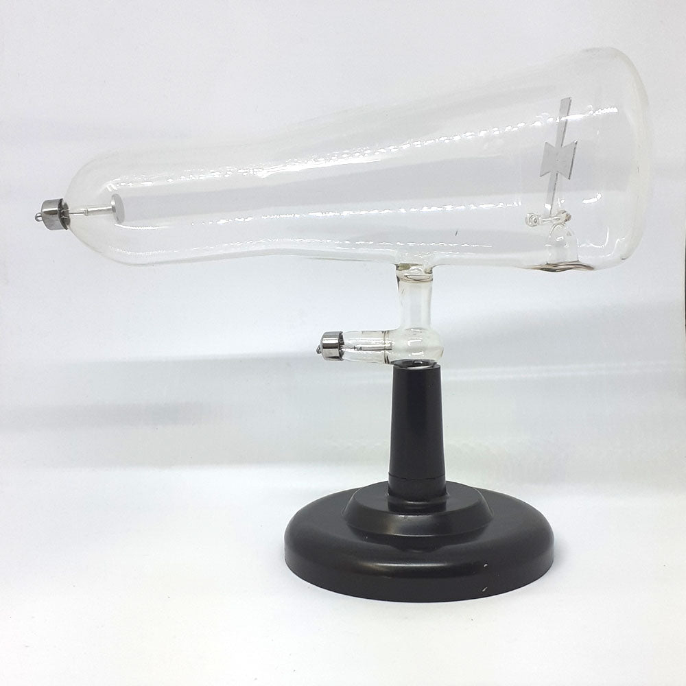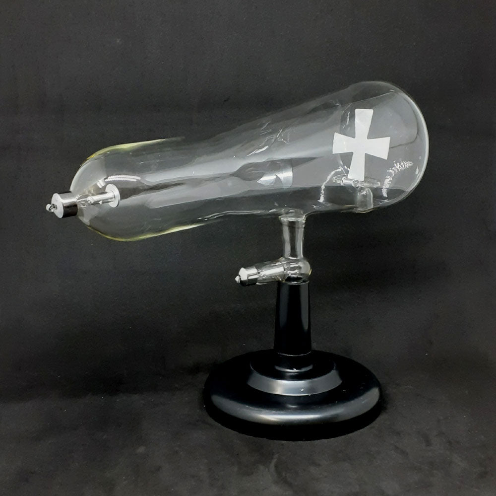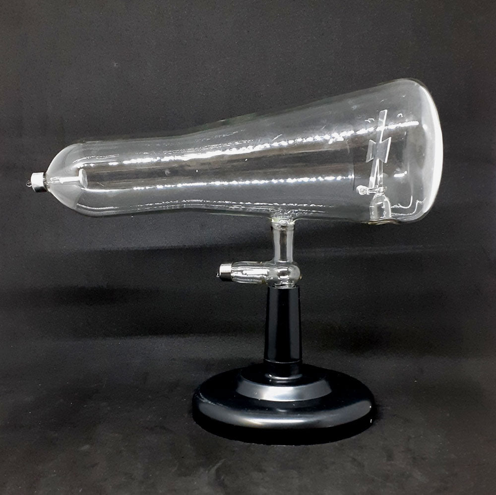 Demonstrates that cathode rays move in a straight line. Demonstrates that cathode rays deflect in magnetic field. Bring a magnet close to the bright image on the plate and see the rays deflect. All Crookes Tubes (CRT'S) require a very high voltage power source such as an Induction Coil (42IC) which produces 10 to 50 KV continuous voltage.