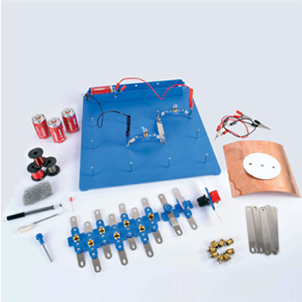 Enables students to investigate nature and properties of electricity by using simple circuits which are easily constructed on a base board. The connector system uses P.C.B. strips with cut-out sections whose ends can easily be inserted in spring terminals, ensuring low contact resistance and ease of connection. The kit consists of:
