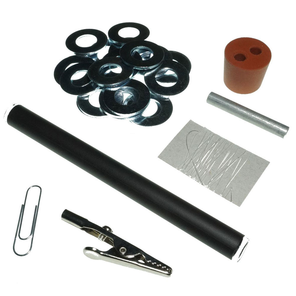 This PSSC kit consists of a glass handle (low friction) and a cord with weights (metal washers) and paper clip, rubber stopper, a wood dowel and an alligator clip.