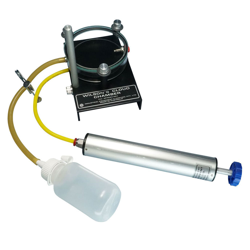 Wilson's Cloud Chamber is the classical pattern where alcohol saturates a pad in the chamber and a vacuum pump (reversed tyre pump) is used to draw a partial vacuum to super saturate the remaining air with alcohol vapour. A small alpha source in the chamber emanates particles that ionise the air particles along the path. The alcohol vapour condenses on these ionised paths to display miniature foggy tracks inside the chamber. These tracks can be called the path of the radiated particles. A light source is required (microscope lamp or similar) to illuminate the cell and a 'pin source' of Alpha material is required (Cat. 44WCCR).