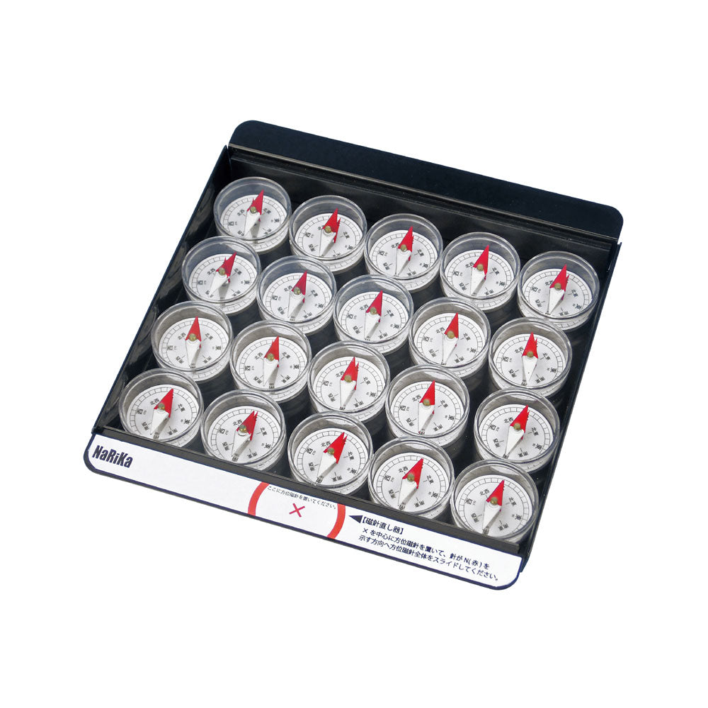 Deluxe class set of 20 high quality 40mm diameter compasses in a handy storage tray with a calibration strip that re-magnetises compasses into the correct orientation. In the tray, all compasses can be checked at a glance for correct North orientation. Each compass has a red triangle on the bottom face to assist students aligning it to North.