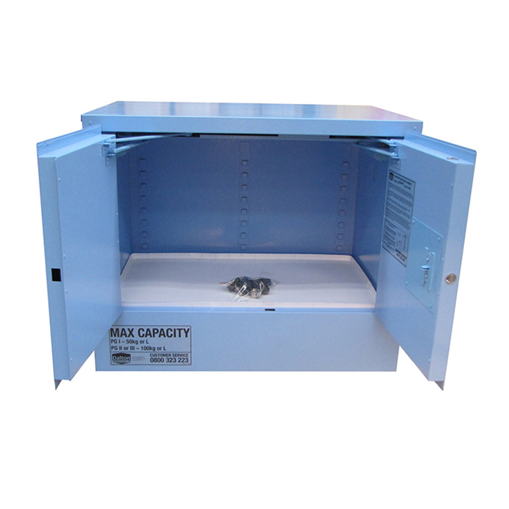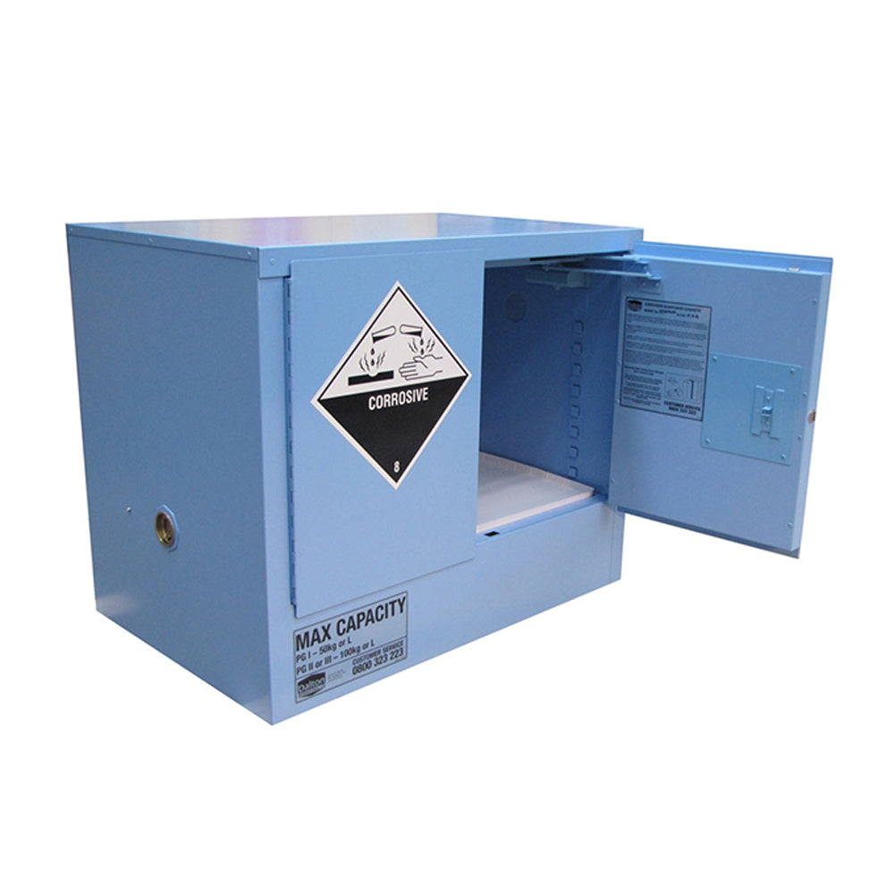 This metal corrosive storage cabinet is suitable for storage of class 8 corrosive substances in liquid or solid form including acids, alkalis, caustics, sodium hydroxide solutions and hypochlorite solution. It is manufactured to meet AS 3780 standards for the storage and handling of corrosive substances.