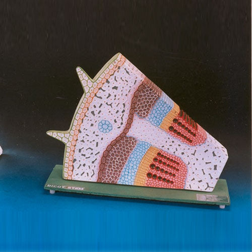 This model shows the transverse and longitudinal section of a dicotyledonous stem in which case the cambium ring has been formed but no secondary growth has yet taken place. Useful model for study of epidermis, lentice, cork layer, cork cambium, cortical parenchyme, starch sheath, medullary rays, phloem, sieve plate, sieve tube, phloem parenchyma and inter fasicular cambium. xylem, pitted vessels, bordered pitted vessels, annular vessels, spiral vessels, pith etc. Mounted on base, with key card.
