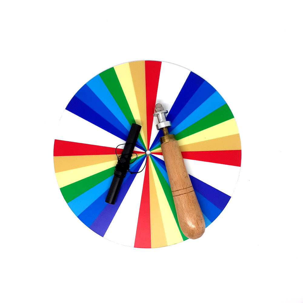 Colour Disc (Newtons), Hand Spin, Diameter 23cm. Spin by pulling cord on pulley fixed on handle. Colours disappear and the wheel appears to have turned white when spinning! At rest, the wheel consists of separate colors. Is this true when it's in motion? Demonstrates that light consists of a number of coloured wavelengths.