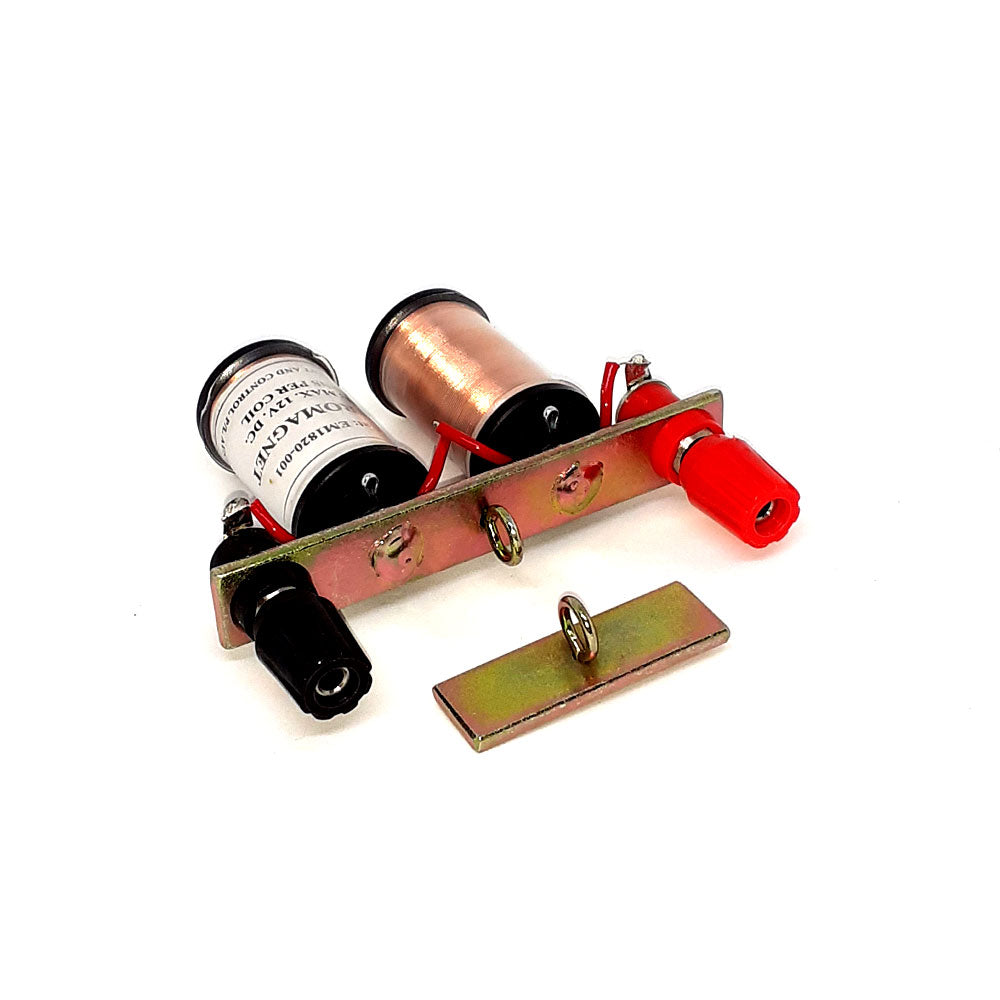 A simple electromagnet. Two coils of 600 turns wound on steel centres that form a magnetic yoke. The coils are connected to 2x 4mm spin free IEC terminals. A steel plate with a hook fitted becomes the 'armature' (moving part) of the electromagnet. The force holding the armature to the cores increases with the increase of current through all the turns of both coils in series. Can be used on either AC or DC to demonstrate differences.