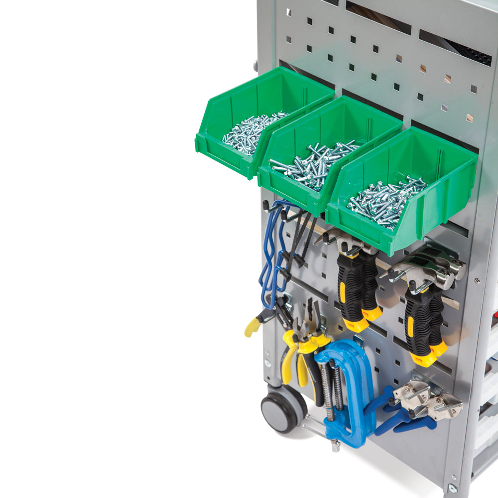 This version comes complete with an accessory pack including 12 green mini bins, a roll holder, 5 single hooks, and 5 double hooks, giving you versatile storage options for tools, components, and materials. The side and back panels feature industry-standard holes and slots, making it easy to reposition accessories and customise the trolley to suit your projects.
