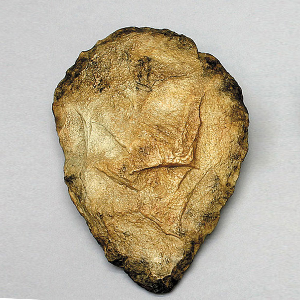 Replica Acheulean Hand Axe - 1.2 MYA from East Africa. The definitive tool of the Acheulean. Although the size varies, the ovoid shape and the proportions remain very consistent over all of Africa, Europe and the Middle East, for more than a million years. Their use is controversial. Edge wear analysis shows that some were used for ordinary purposes like cutting meat and wood. However, the consistent shape and proportions over such a long period have led some to claim that they were missiles; that is, they were thrown. Research conducted at UCLA involved students throwing actual hand axes