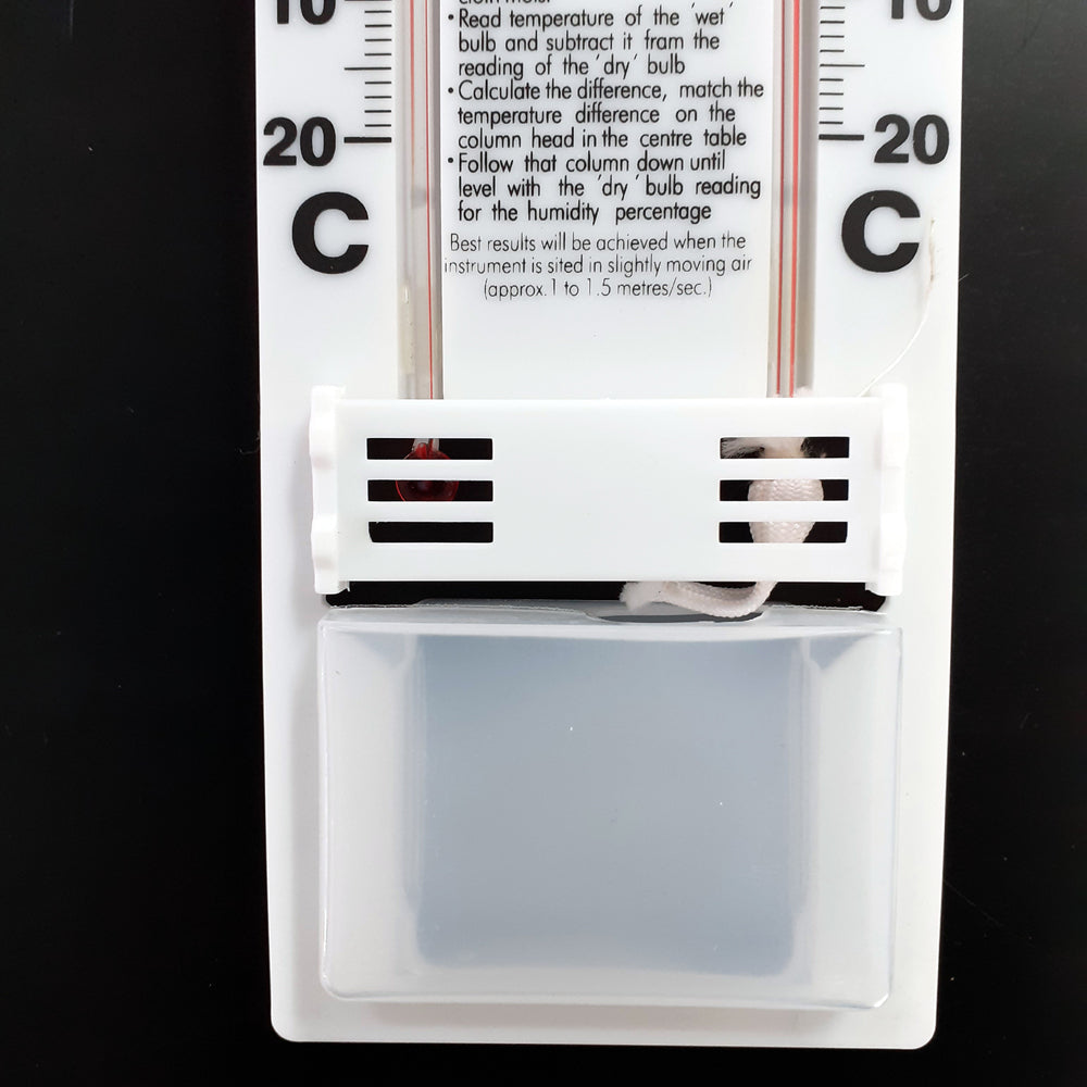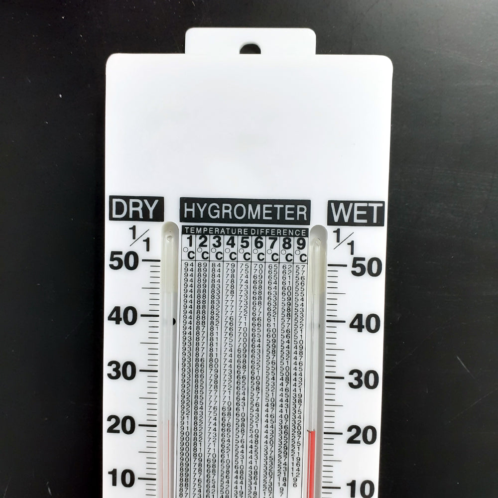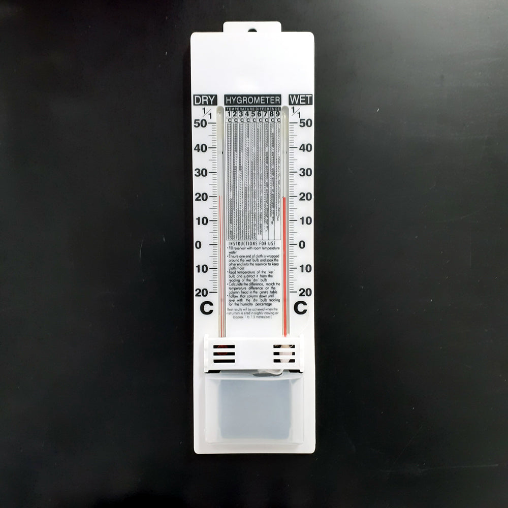 Hygrometer Wet/Dry Bulb, hanging. Red spirit plastic type with calculation table. -50 degrees to +50 degrees.