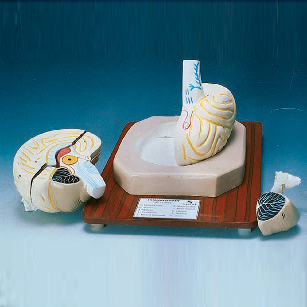 Life-sized detailed 4-part sectioned model. The right hemispher has the cerebellum and the stem with occipital lobe. On Stand with Key Card.