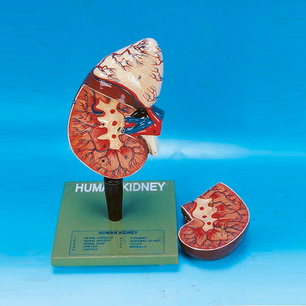 Dissectable into 2 parts, shows kidney with adrenal gland, renal and adrenal vessels, and upper portion of ureter. Front half of kidney removable to show cortex medulla and vessels as well as renal pelvis. On stand with key card.
