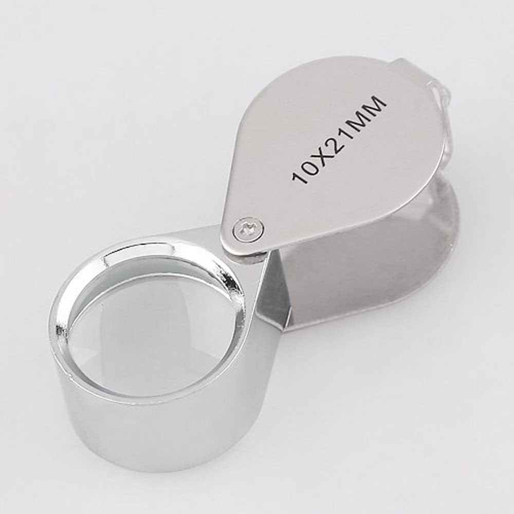 10x magnification, folding pocket magnifier. Solid Chrome metal construction with glass lens. Supplied in case.