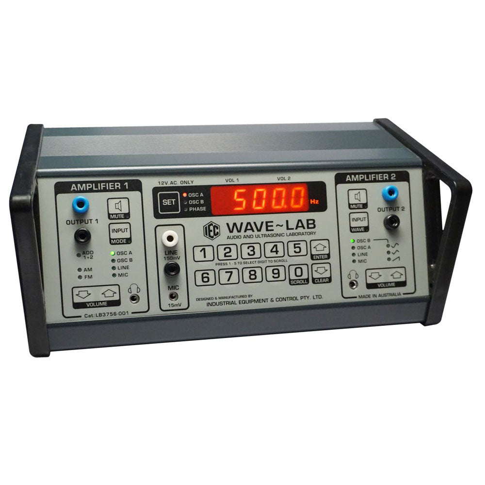 The IEC digital "Wave~Lab" is a special dual wave Signal Generator for the study of wave theory. This microprocessor generates 2x sets of very accurate and absolutely stable frequencies up to 40kHz that can be added to one another, exactly shifted in phase relative to one another or modulated by one another. Waveforms can be selected as sine, triangular or sawtooth and high power amplifiers permit the driving of large speakers or headphones for private listening. An oscilloscope can be used to view the waveforms and effects. Harmonics, beat frequencies and other phenomena can be studied. Output power is digitally controlled and a keyboard system allows any frequency to be entered. External signals can be applied and a microphone and headphones are included in the kit. A pair of suitable wide range speakers is available. Instruction Sheet