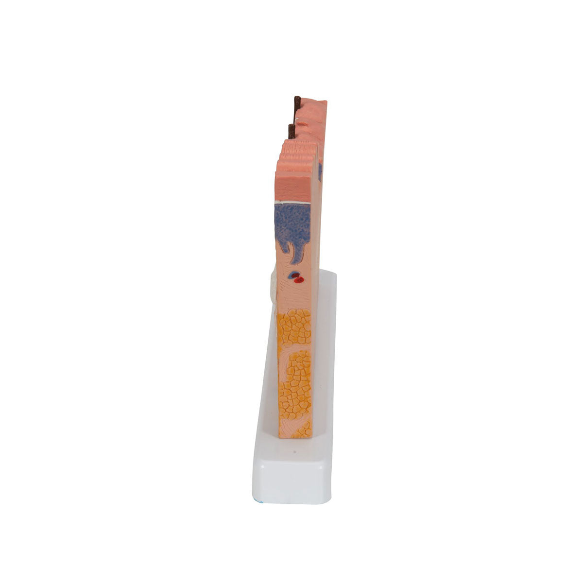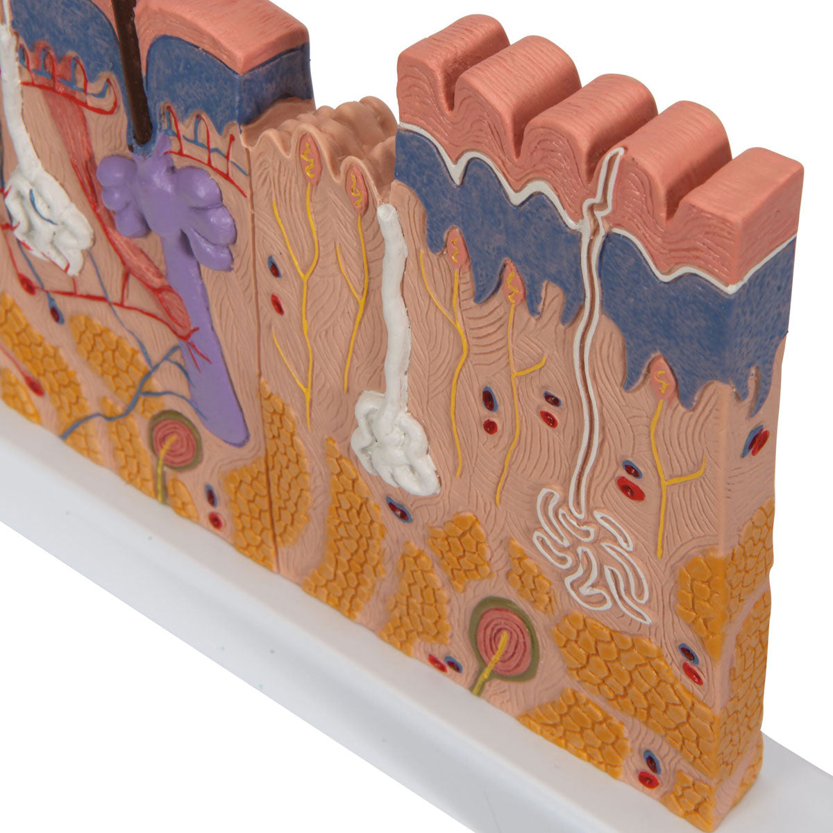 The two halves of this skin relief model show the three layers of hairy and hairless skin in order to make clear the differences of the skin layers. This skin model features detail with hair follicles, sebaceous glands, sweat glands, receptor, nerves and vessels. This skin model is a great tool for demonstrating the anatomy of the human skin. Skin section delivered on base.