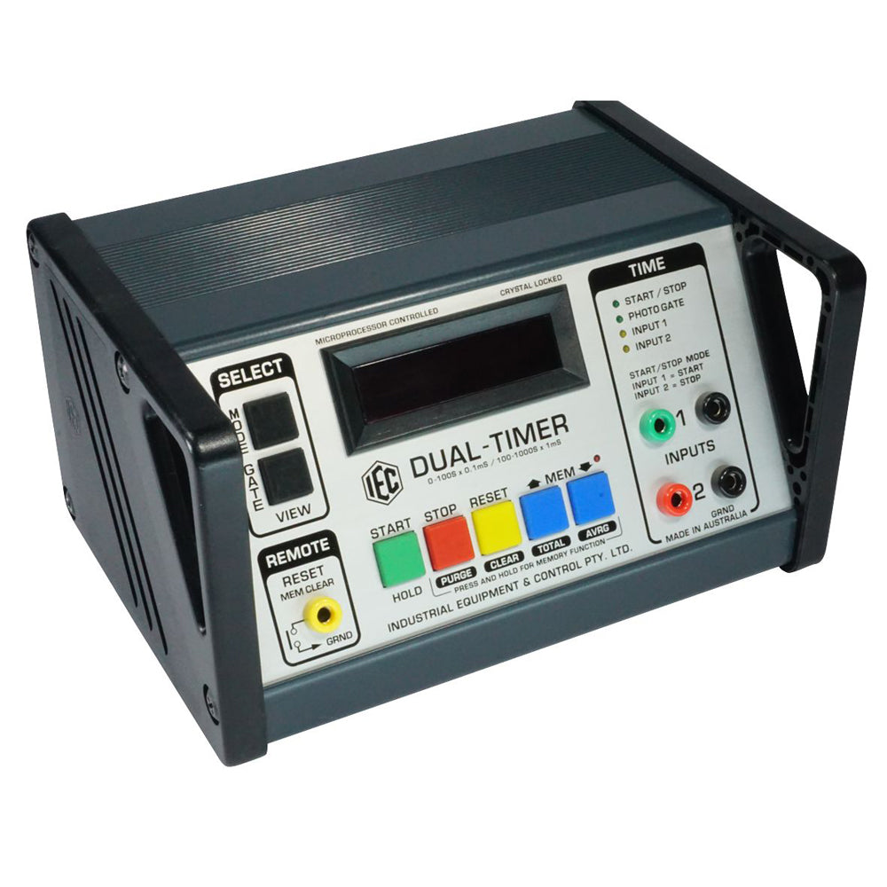 For LINEAR AIR TRACKS, this mains-operated Dual Timer can connect to 2 separate Photo Gates and can measure and store their times separately for later recall. When not using an Air Track with PhotoGates, the timer can be used as a general Lab Timer.