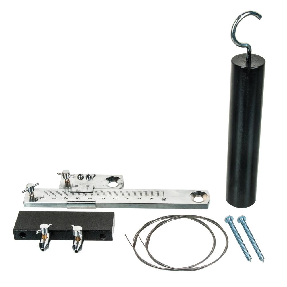 The setup includes a 10 cm engraved brass scale with a vernier that reads to 0.1 mm, allowing accurate measurement of wire elongation under tension. Supplied with a tension weight, this apparatus is ideal for physics labs studying stress, strain, and Hooke’s Law.
