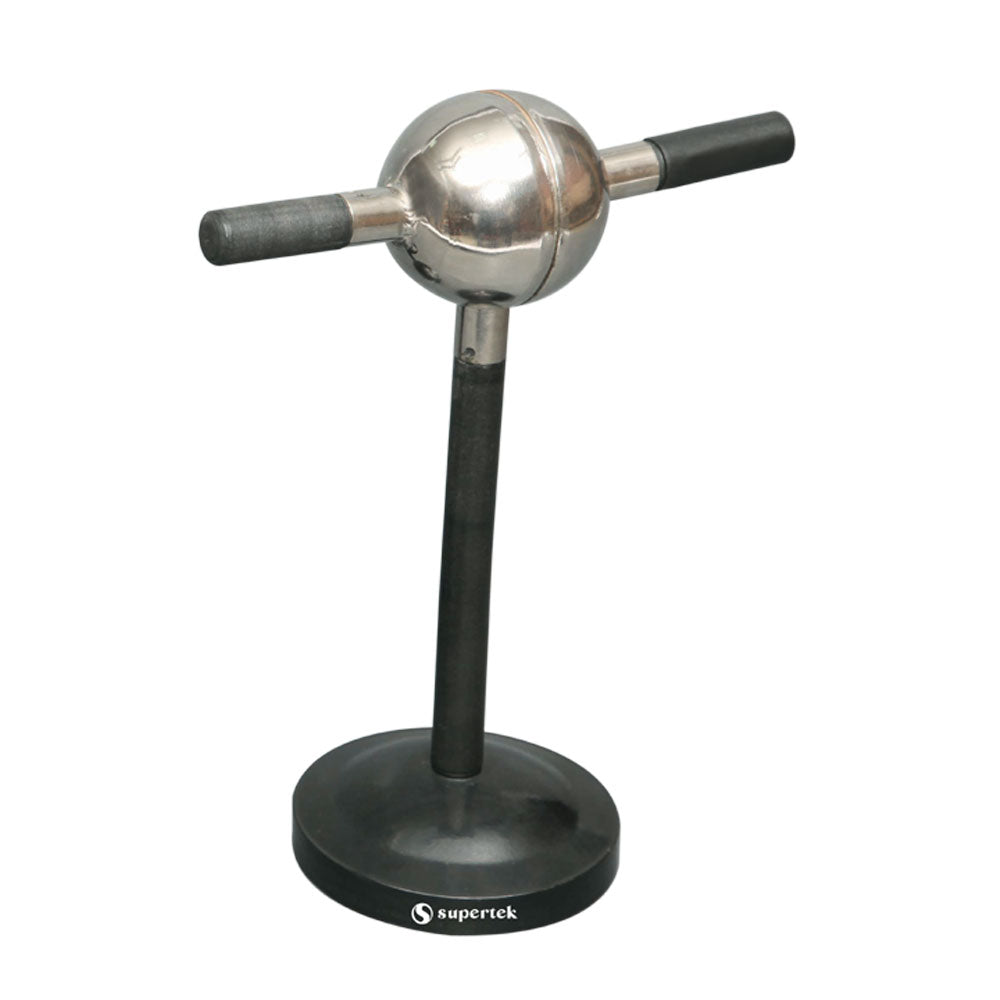 A spherical conductor on an insulated stand with two hollow hemi-spheres, each with insulated handle, to show that electrostatic charge resides on the outer surface.