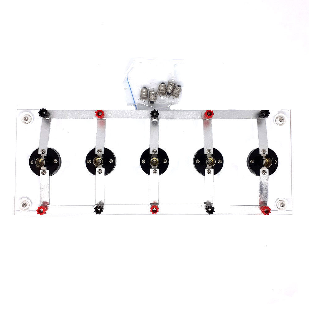 This board is ready to operate with 5 MES lamps supplied. MES batten holders mounted on Perspex with removable plated connectors secured by knurled nuts. Series or parallel circuits can be easily set up. (Ideally used with digital multi-meter Cat. 44MMP).