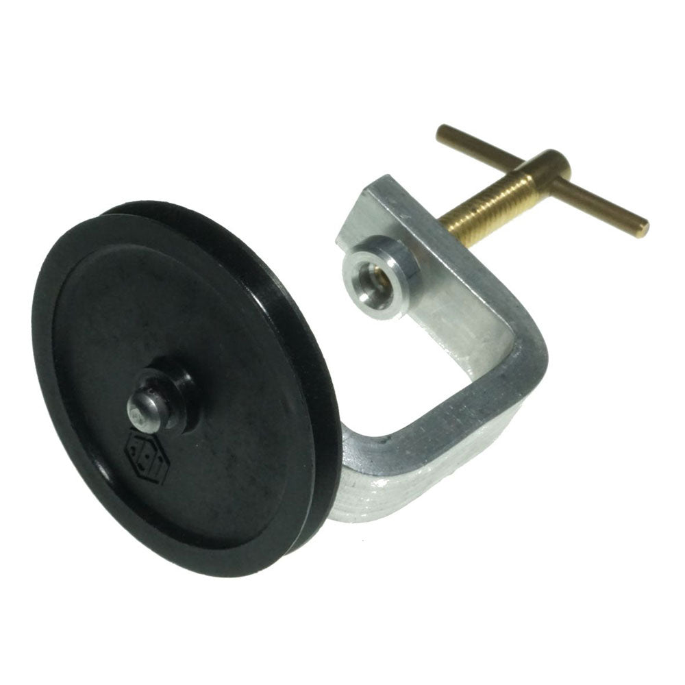 This is a 50mmD Nylon pulley mounted on a strong aluminium frame for clamping to a bench top (or any flat surface). The maximum clamping thickness is 25mm. When clamped, the side of the pulley is parallel to the surface of the bench. The clamp screw has a protective pad on the tip so the bench surface is not damaged. This style of pulley is normally used for taking a cord close to the table top and passing the cord back over the table top. (see also Cat.45PSB)