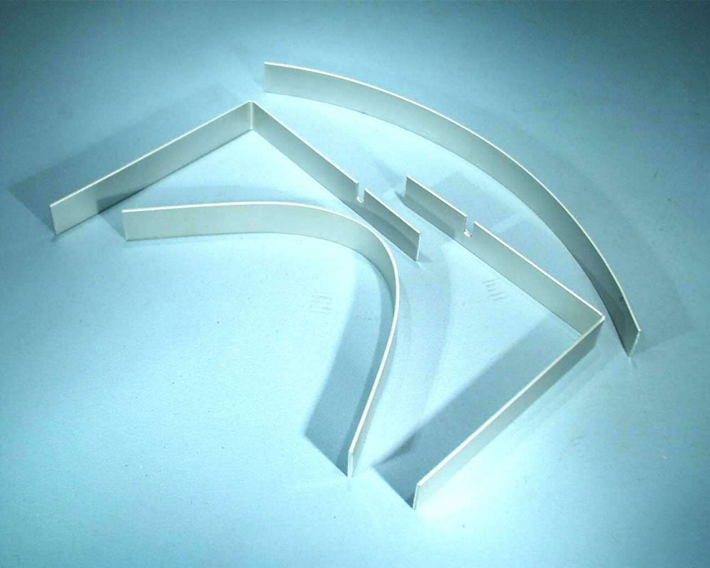 Spare parts for the old IEC Ripple Tank; set/4 barriers to place in the water. Alloy shapes to create parabolic and part round 'mirrors' and a set of straight pieces to form slits for experiments in diffraction and reflection.